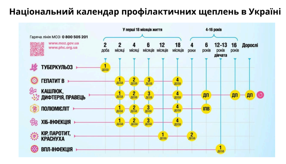 Кожна країна розробляє свій графік щеплень від тих чи інших хвороб. В Україні це Національний календар профілактичних щеплень. Згідно з ним, держава безоплатно забезпечує нас щепленнями від 11 найнебезпечніших інфекцій, серед яких: